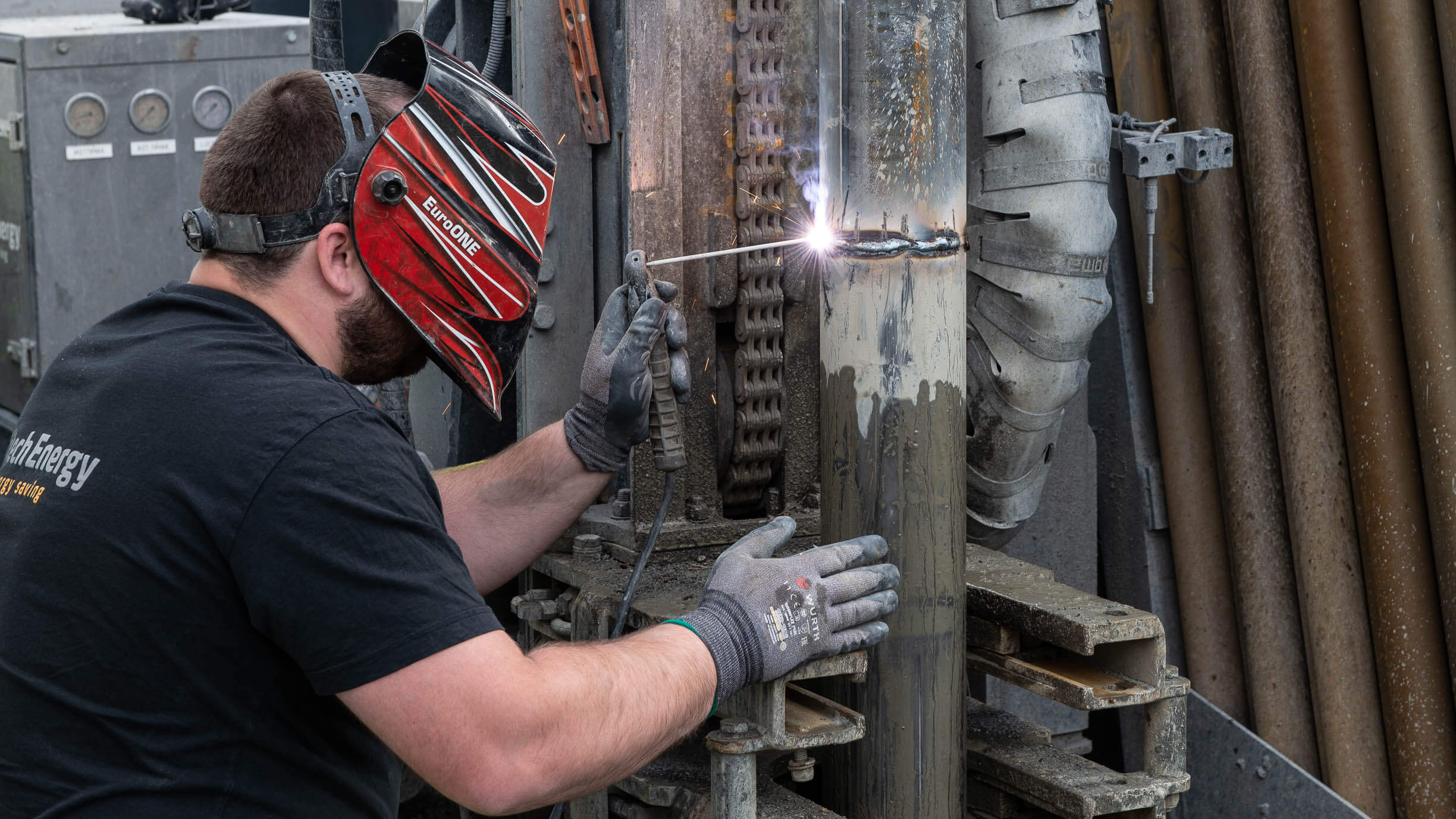 Her sveises rør til en energibrønn sammen. Jo mer varme ei bergvarmepumpe skal levere, jo flere meter energibrønn trenger den. Antall meter totalt bestemmer hvor mye varme ei bergvarmepumpe kan hente under bakken. For privatboliger er det gjerne nok med en til to brønner.