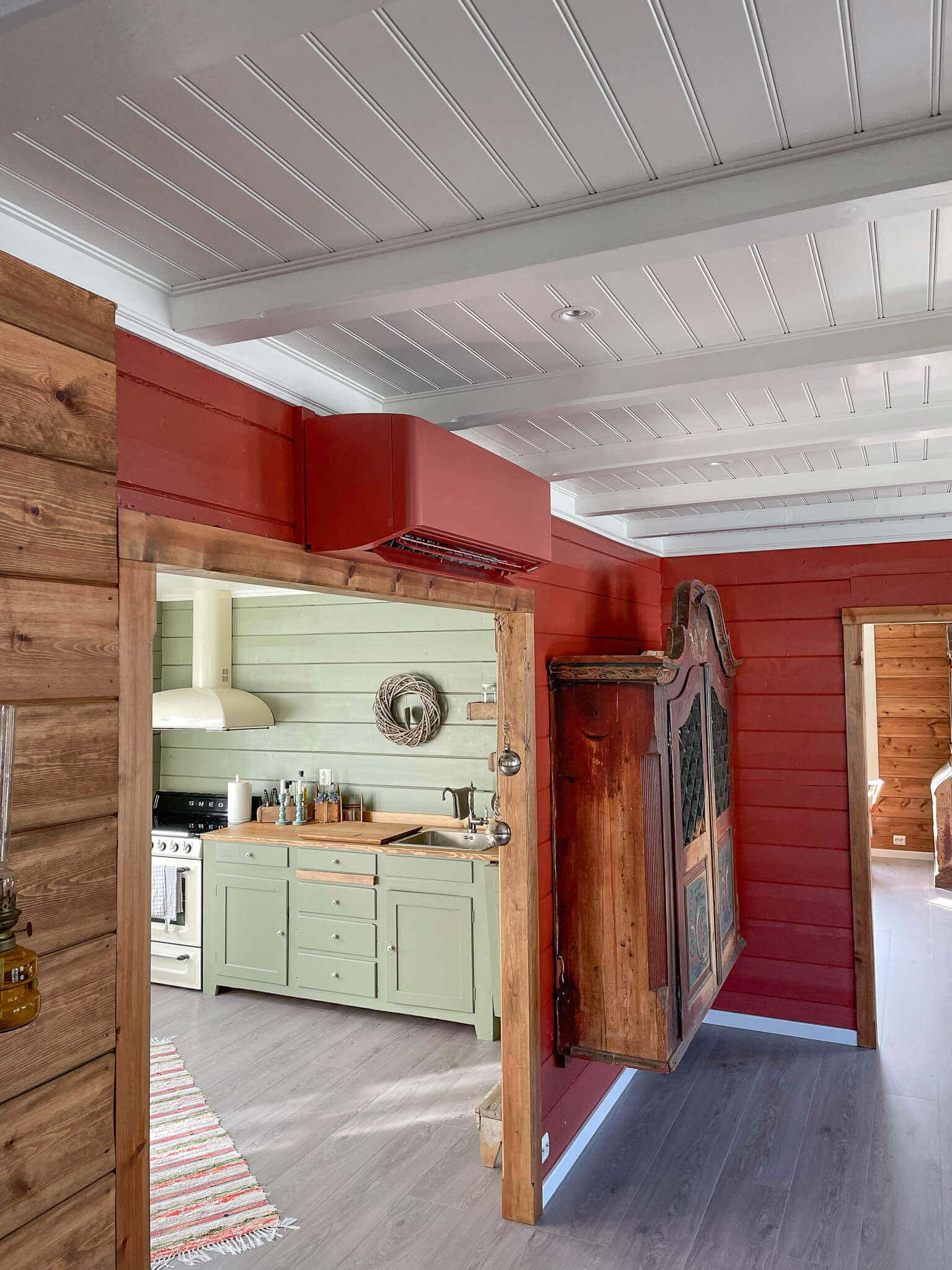 Innedel lakkert i samme rødfarge som veggen gir et mye mer diskret resultat. Foto: Lunheim Elektro.