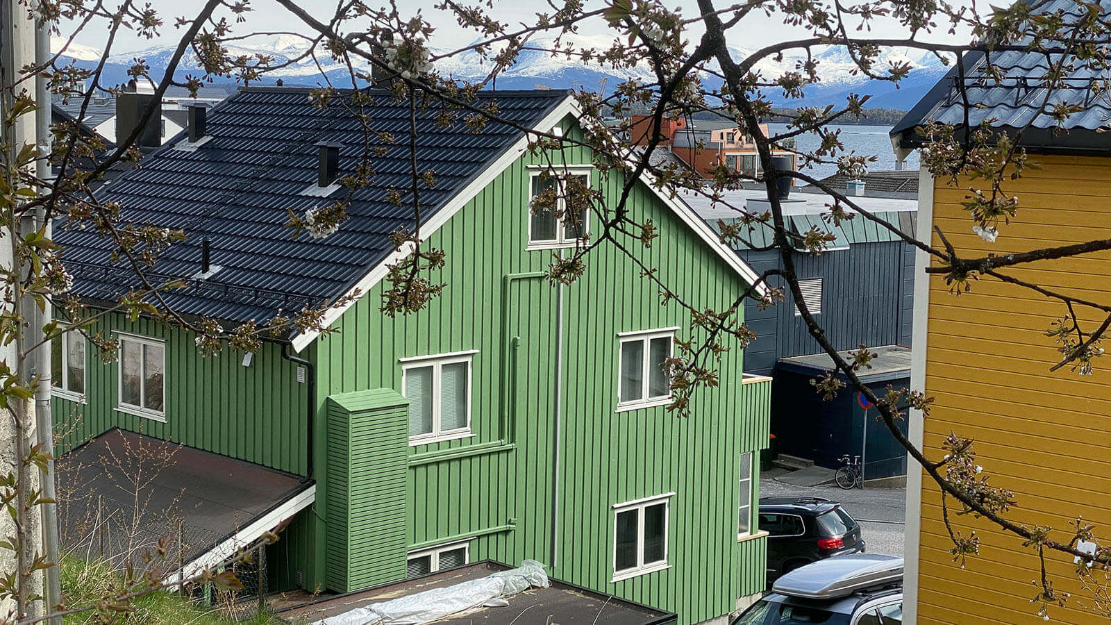 Disse utedelene er godt synlige fra gaten, men det å male varmepumpehus og kanaler i samme farge som huset gjør dem mye mindre framtredende. Foto: Ola Hjelen, Møre og Romsdal fylkeskommune.